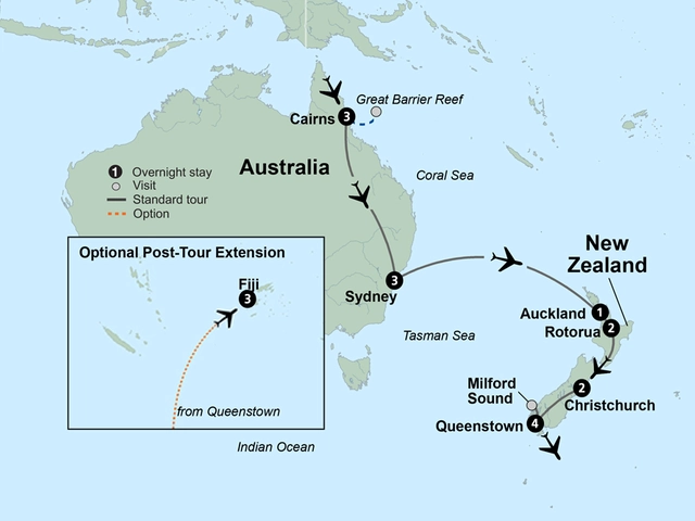 See what life is like “Down Under” on this incredible journey through New Zealand's North and South Islands and along the coast of Australia. Visit Auckland and gain insight into Polynesian culture. Experience a Hangi dinner celebration. Visit the Agrodome and observe a sheep-shearing demonstration. Experience Queenstown, the “Adventure Capital of the World.” Cruise Lake Wakatipu and enjoy a lakeside barbecue. Cruise Milford Sound and Sydney Harbour. Discover the wonders of Aboriginal culture. From the ethereal beauty of New Zealand's glacial fjords to the tropical splendor of Australia's Great Barrier Reef, enjoy the best of the South Pacific.